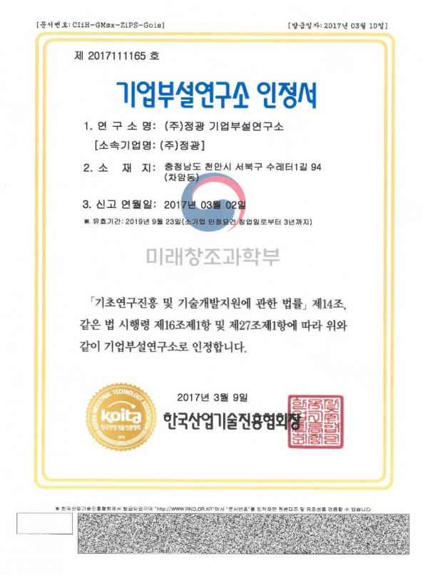주소 : 31094 충청남도 천안시 서북구 백석공단 1로 69 ㈜정광 Tel :041-621-2886 Fax: 041-621-2888 Copyright © Jung kwang co.,ltd. All rights reserved.